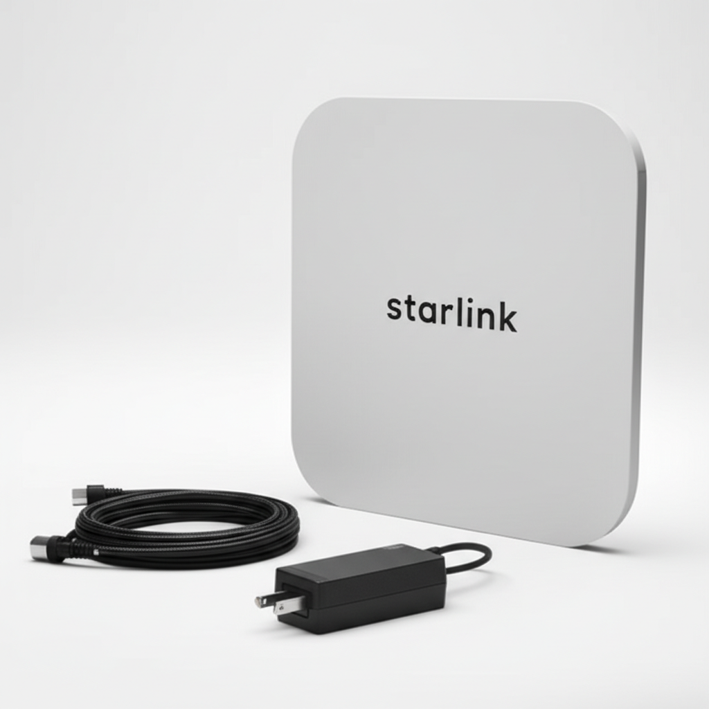 - Starlink Dish V3 (Gen 3): The latest rectangular dish with integrated motors for automatic positioning. Now includes built-in WiFi 6 router (no separate router needed), simplifying installation and reducing cable clutter.